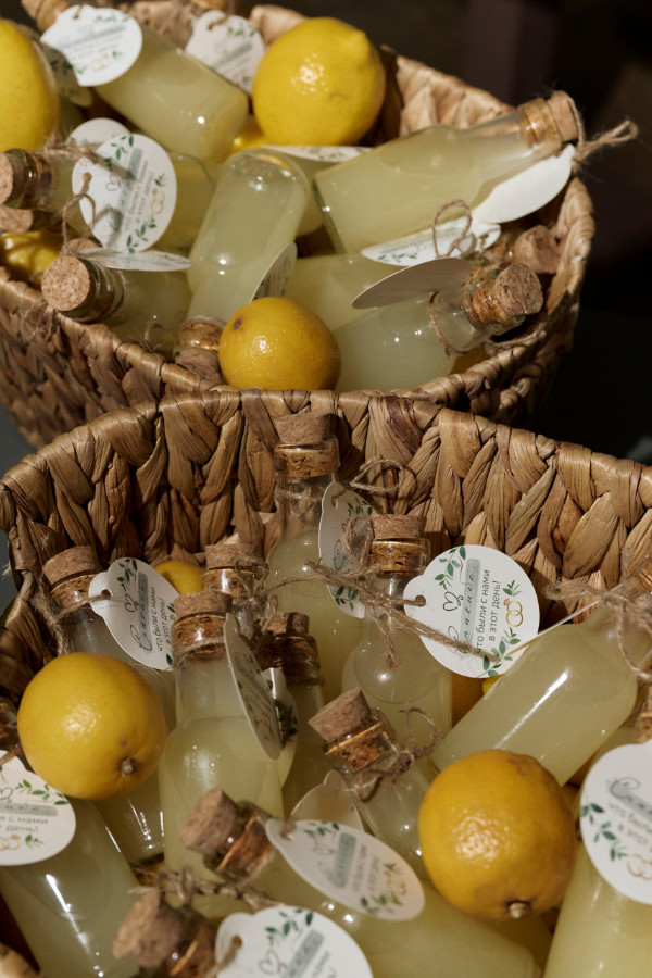 А потом — сюрприз для гостей. Саша и Света приготовили домашний лимончелло, разлили его по маленьким бутылочкам и предложили всем поднять бокалы за любовь. Было так по-семейному душевно.