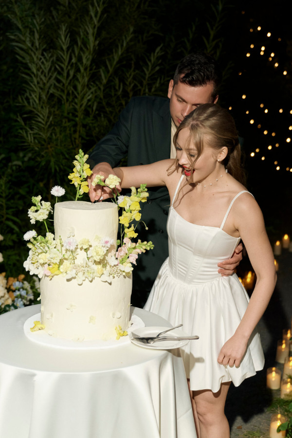 Финальной точкой вечера стала зона с мягким вечерним светом гирлянд и десятками свечей. Именно там, среди огоньков и аплодисментов, ребята разрезали свой свадебный торт.
